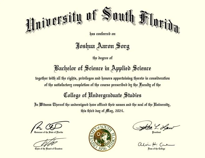 University of South Florida diploma for a Bachelor of Science in Applied Science, awarded May 2024.