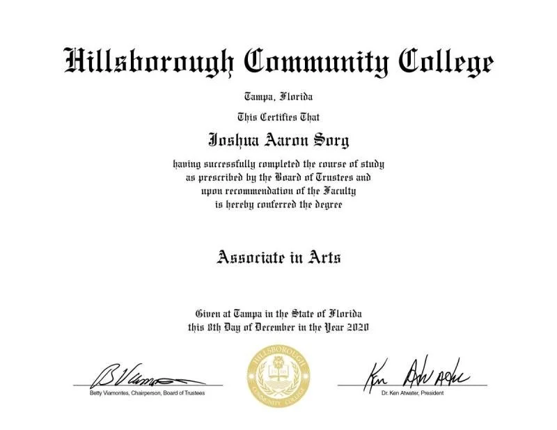 Diploma from Hillsborough Community College in Tampa, Florida, conferring an Associate in Arts degree, dated December 8, 2020.