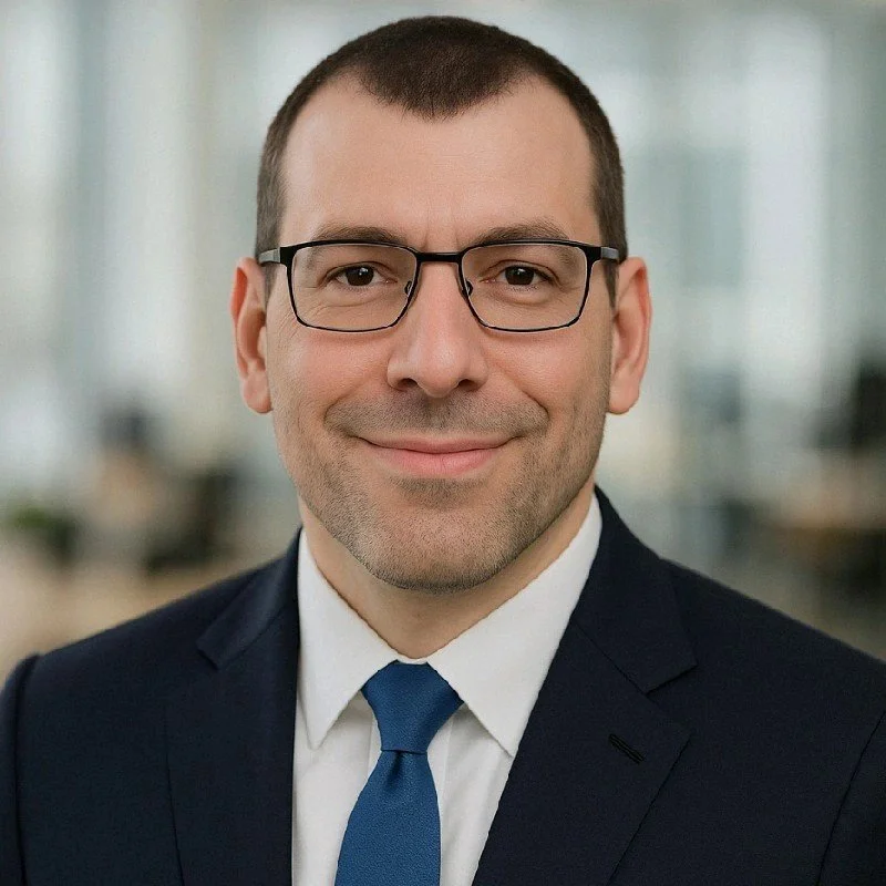 Man in suit and glasses smiling with blurred office background.