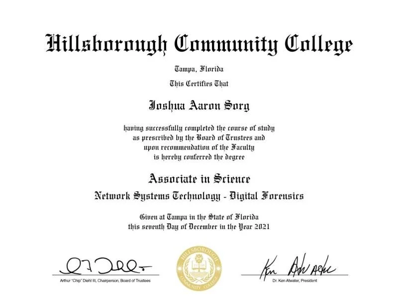 • I completed my A.S. in Network Systems Technology with a concentration in Digital Forensics at Hillsborough Community College while simultaneously working full-time and developing my professional skill set. This hands-on program provided a strong technical foundation in networking, cybersecurity, and investigative techniques used to analyze and secure digital environments.